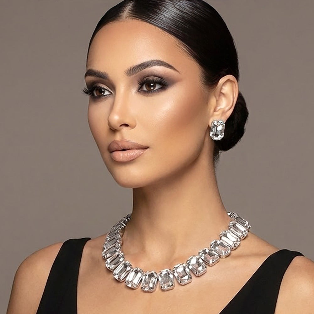 Enhance your style with the Tes Necklace set, featuring a teardrop centered rhinestone trimmed cluster evening necklace which measures 19.5" + 3" L and comes with a 1.7” L decor and 1.6”L earrings. Add a touch of elegance to your look with this timeless piece.