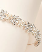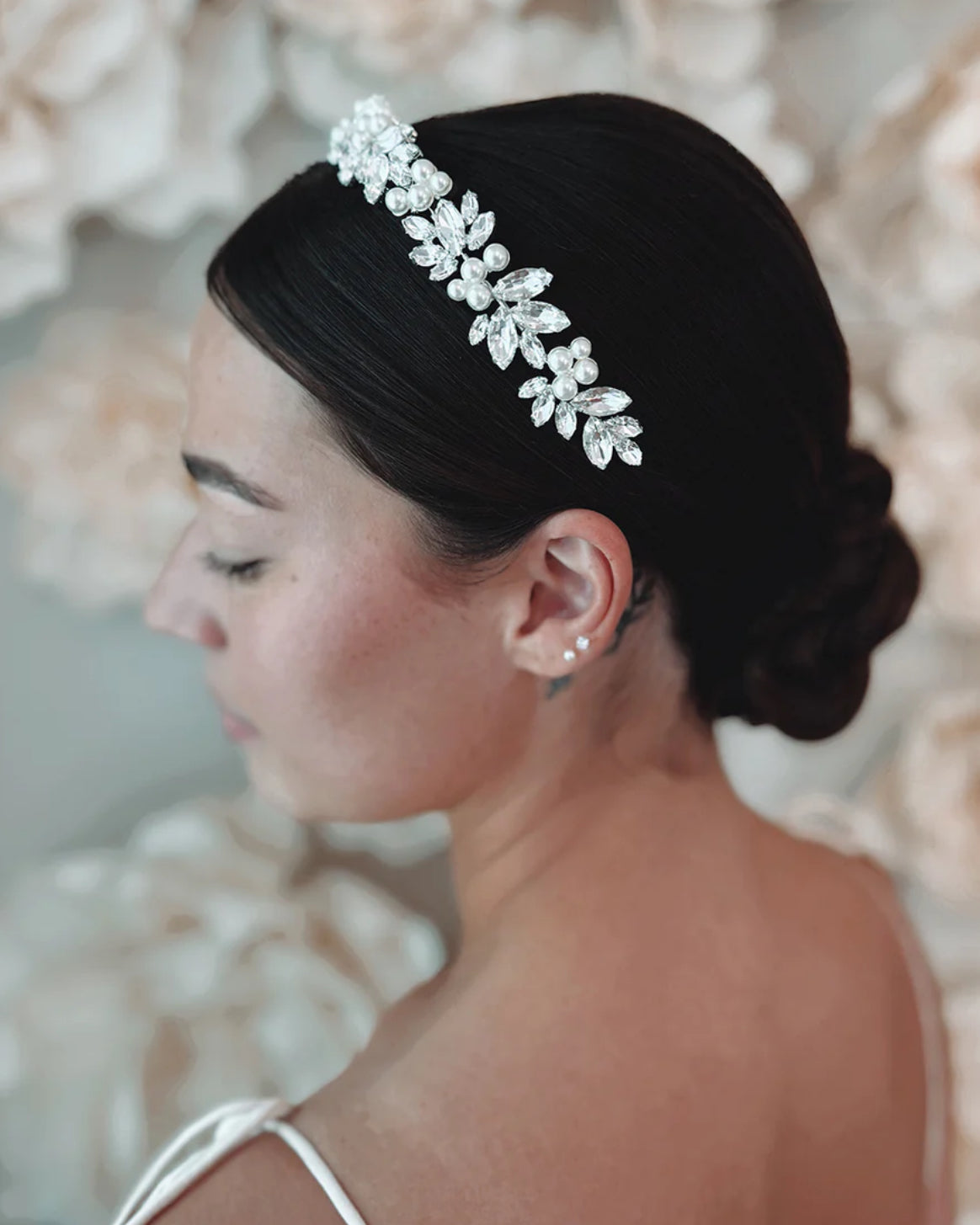 Gene Headpiece is fit for an ultimate bride that desires to sparkle. This exquisite headband is crafted with crystals and pearls, and plated in rhodium for a shimmering finish that resists scratches and tarnish. Handmade and made to order, this delightful piece fits snugly from ear to ear.