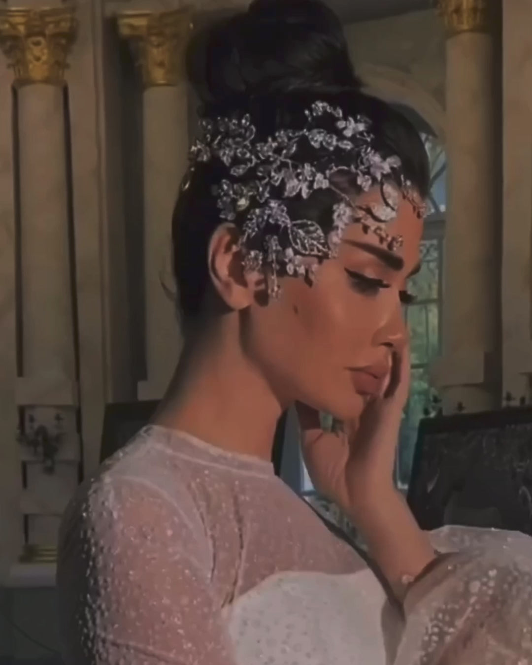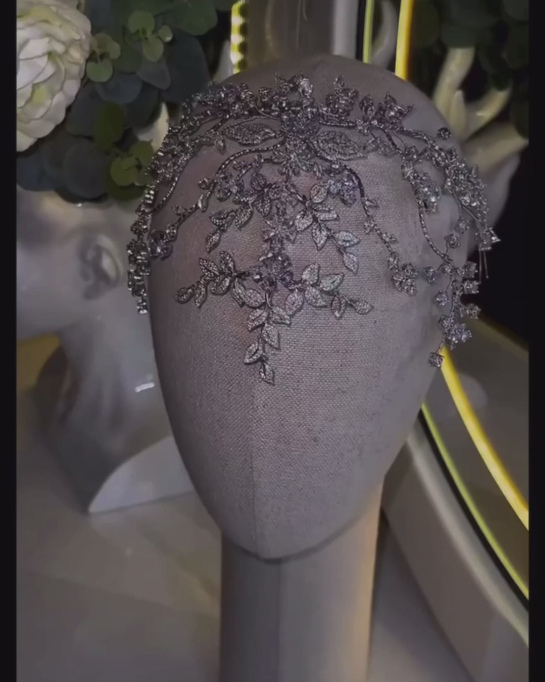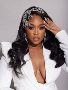 This exquisite headpiece is ideal for any bride who desires a touch of shimmer. It is customized and personally crafted to your liking. The process requires 5-8 weeks to complete, but the end result is a stunning rhodium plating that ensures lasting shine, free from scratches and tarnish. You can choose between two styles: a side piece that elegantly drapes over most of your head, or a full headpiece that stretches from ear to ear.