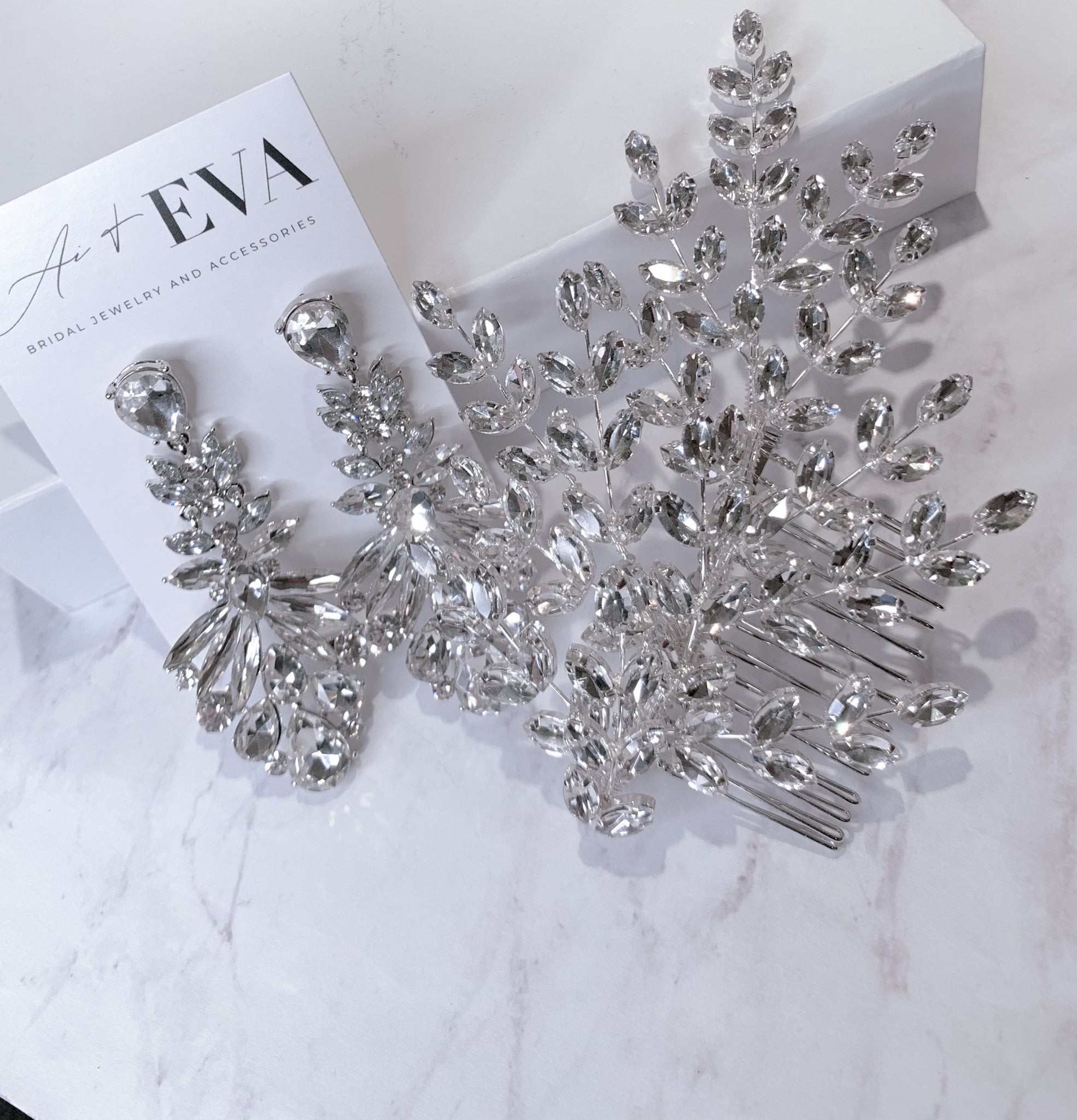 Silver Swarovski or Rose Gold crystal makes up this hair comb. This is great for a styled side part or pulled back bun. An option to come in Rose Gold.