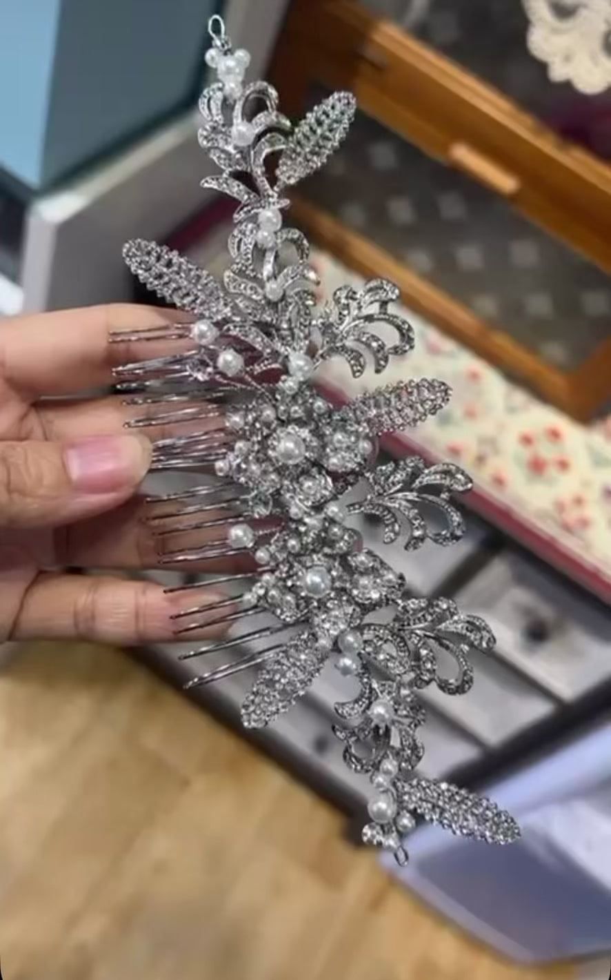 Apart of the AE Collection Silver Swarovski crystal makes up this hair piece.
