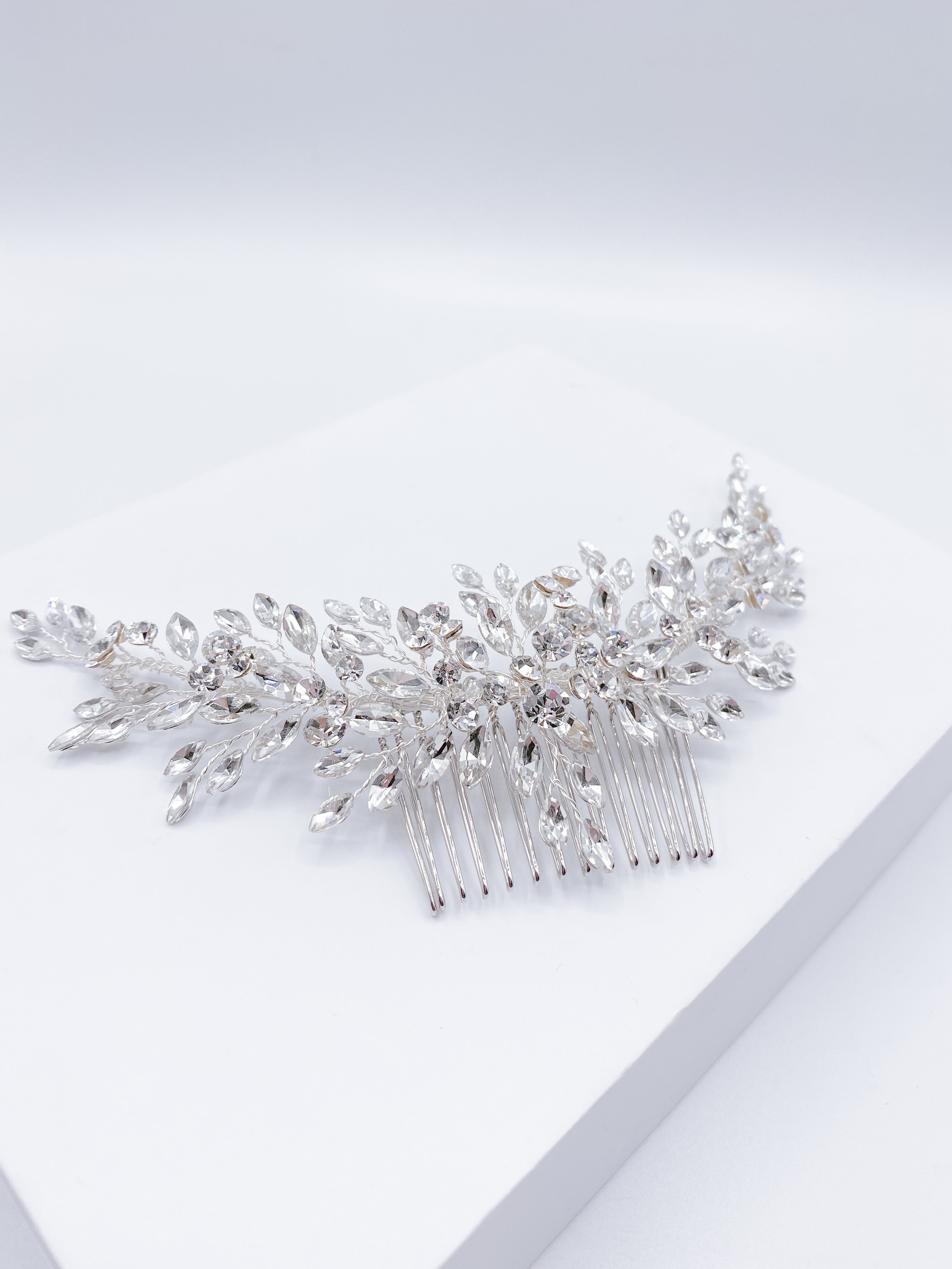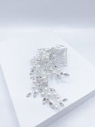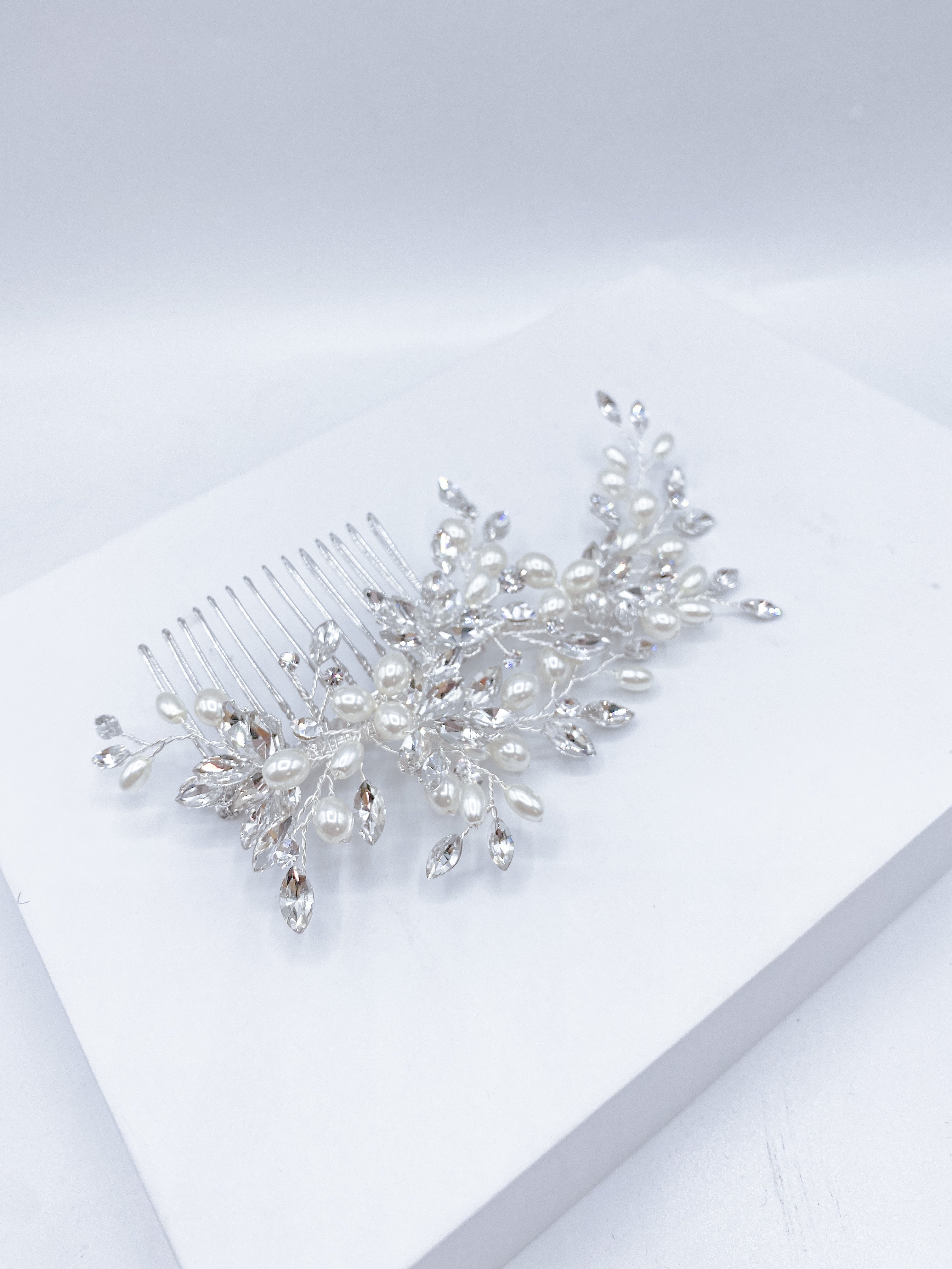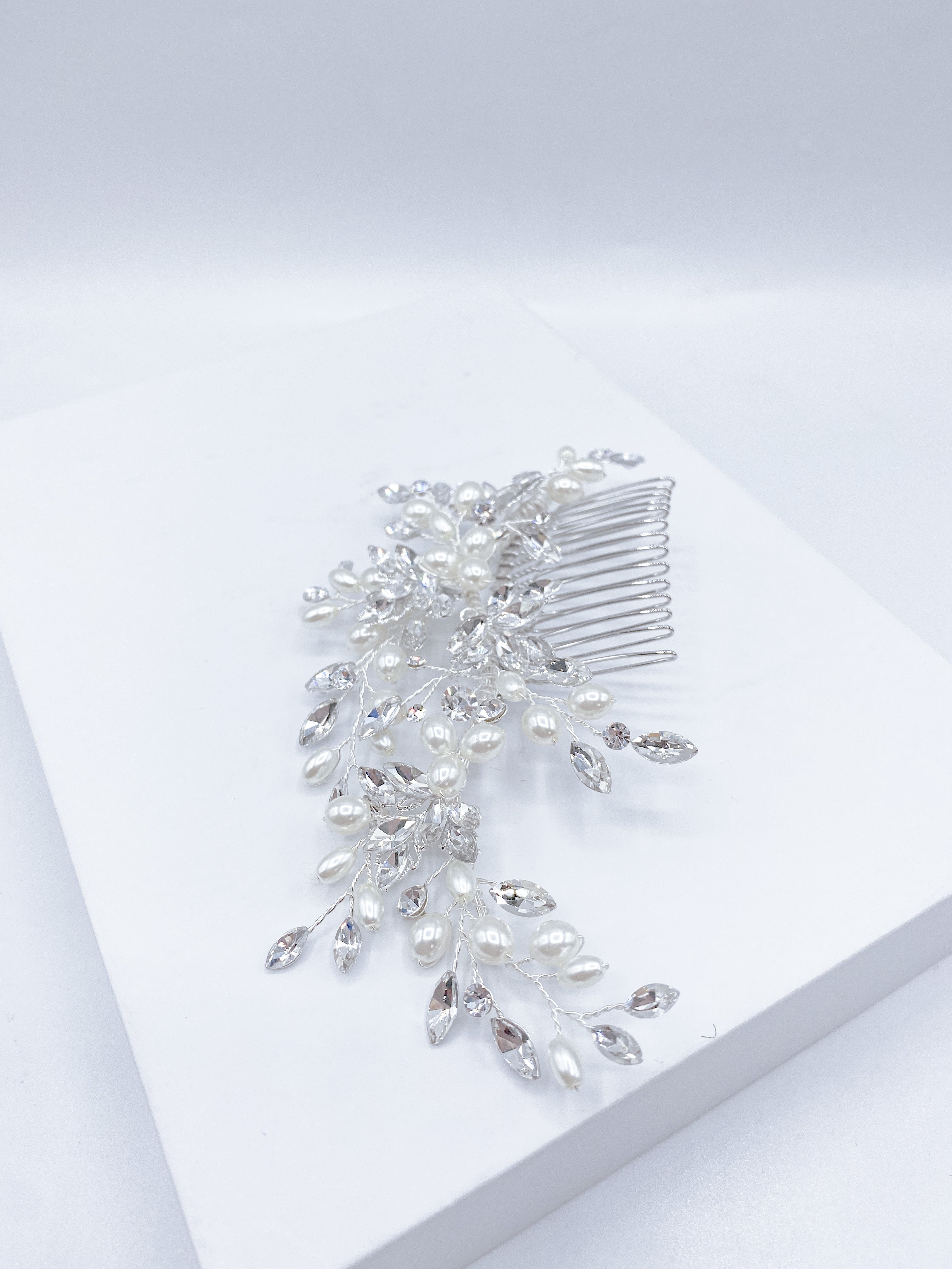 Silver Swarovski crystals and ivory water crystal makes up this hair comb.