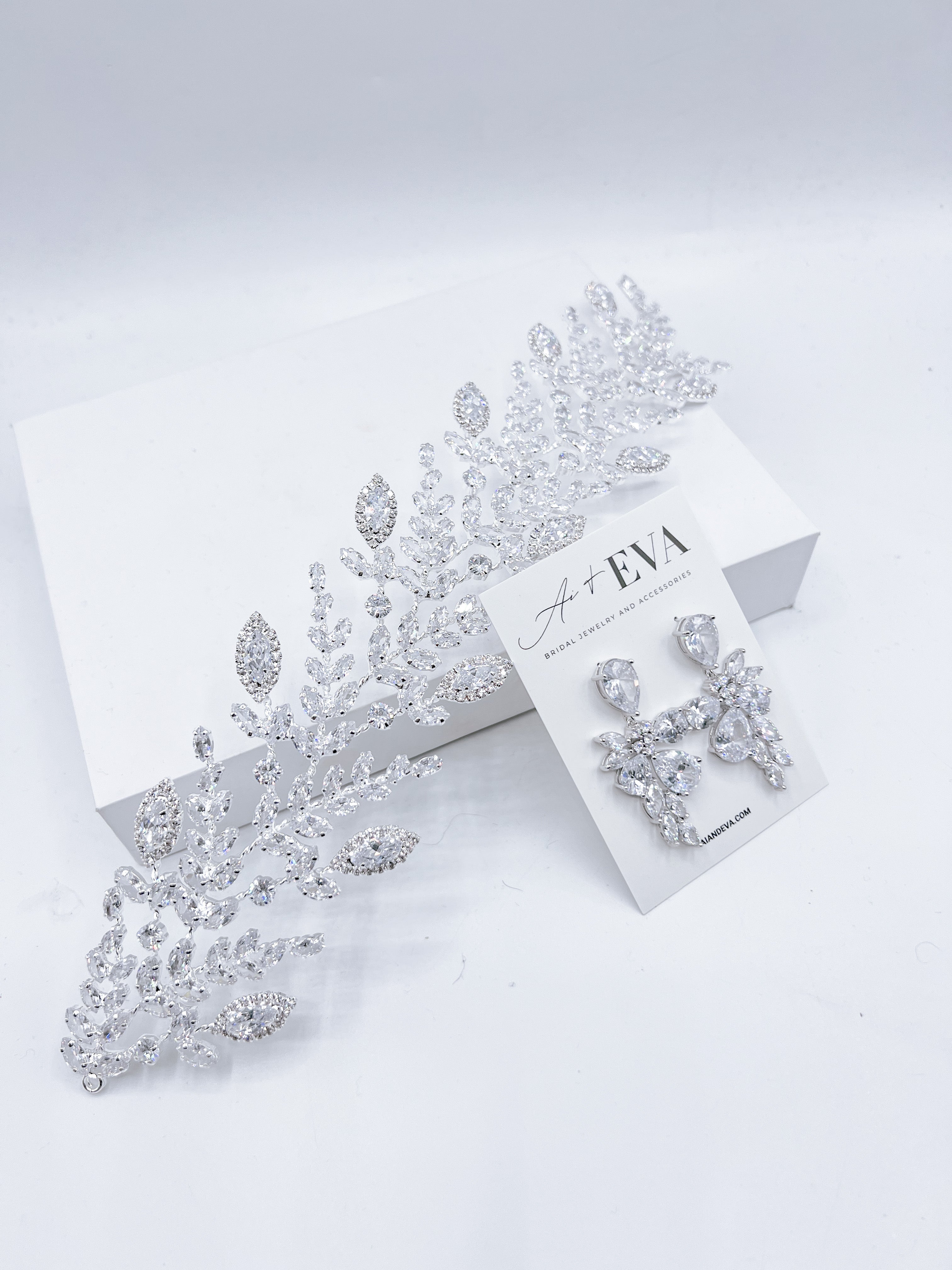 Made to order This elegant Brickell wedding headpiece features a pristine cubic zirconia design that adds a subtle sparkle to your special day. Perfectly crafted, this headpiece will be the perfect finishing touch to your wedding look. Rhodium plated gives it the most luxurious shine and luster. This helps it to guard against scratches and tarnish to use over and over.
