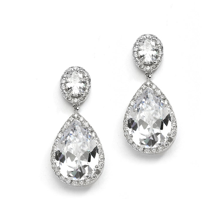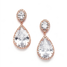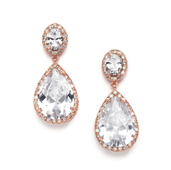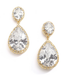 Emily bridal earrings are designed with an oval crystal that cascades into a pear-shaped drop; the drop is surrounded by a halo of stones. Available in rose gold, silver, and gold. This style is one of our most popular. Clip-on available - please let us know at checkout.