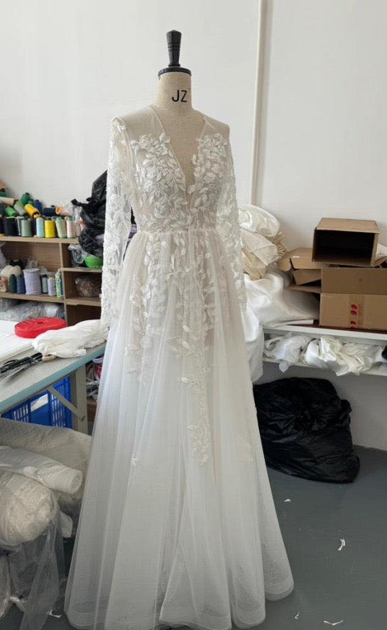 This luxurious robe features a blouson sleeve with delicate scallop hem and waist tie that hooks at the front. Laser cut Ivy flowers appliqués details sewn into the lace. The robe is packaged in a sleek gift box, creating the perfect bridal gift. The 4 pearl details on the wrist and puff shoulders give the robe a stylish finish. Made in off-white, it's an elegant robe tailored to any bride.